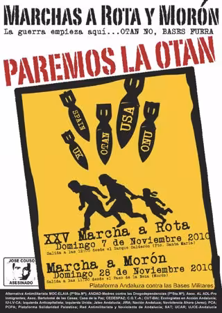 Según ha explicado en rueda de prensa Cristóbal Orellana, portavoz de esta iniciativa, la marcha partirá a las 12,00 horas del parque Calderón de El Puerto de Santa María (Cádiz) y concluirá ante la Base Militar de Rota, donde se procederá a la lectura de un manifiesto.