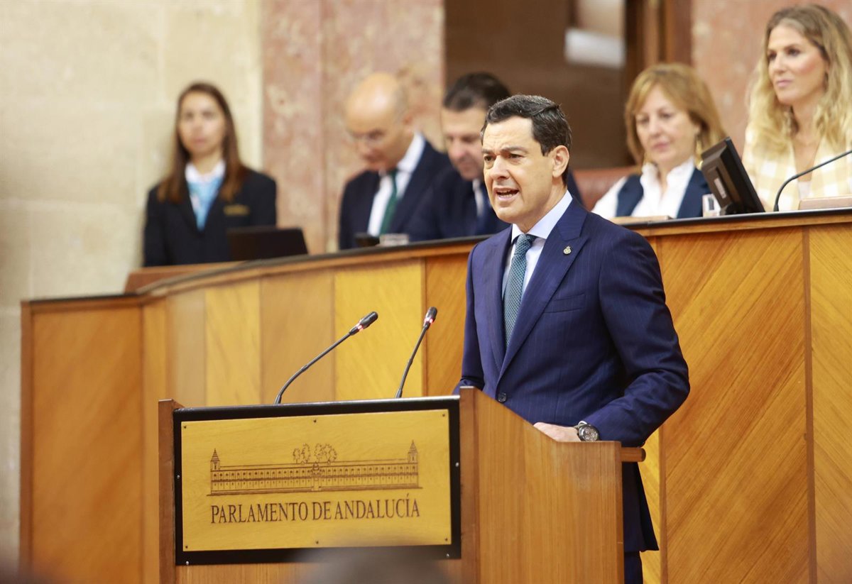 El presidente de la Junta, Juanma Moreno, interviene durante el debate. A 12 de junio de 2025, en sevilla (Andalucía, España). El presidente de la Junta, Juanma Moreno, ha comparecido en el Parlamento en un debate general sobre la situación de Andalucía. - Rocío Ruz - Europa Press
