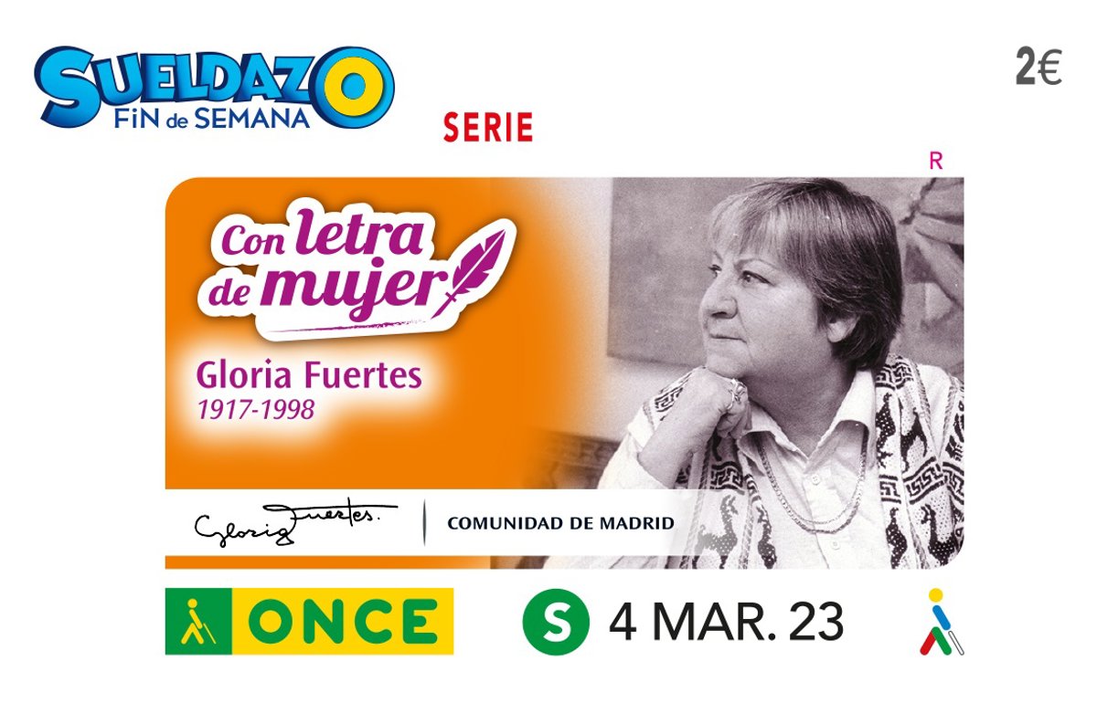 Según nota de prensa, el sorteo de la ONCE de este sábado, 4 de marzo, estaba Gloria Fuertes, dentro de la serie monográfica que la ONCE dedica a las escritoras de mayor relieve de España bajo el lema genérico 'Con letra de mujer', y ha repartido otros 200.000 euros en la localidad almeriense de El Ejido, además de llevar el resto de premios a Aragón, Castilla León, Cataluña y la Comunidad de Madrid.