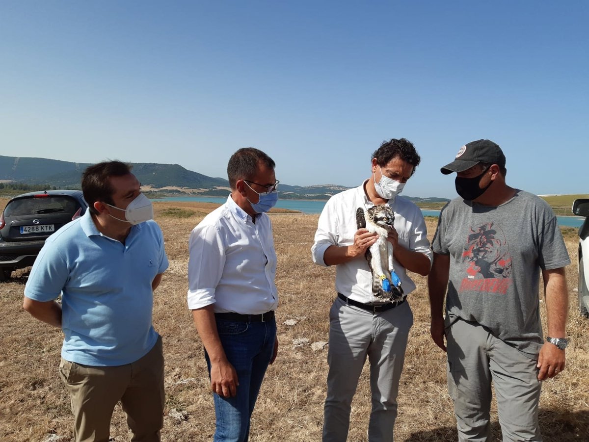 El director general del Medio Natural, Biodiversidad y Espacios Protegidos de la Junta de Andalucía, Ángel Andrés Sánchez, y el delegado territorial de Agricultura, Ganadería, Pesca y Desarrollo Sostenible en Cádiz, Daniel Sánchez Román, junto al presidente de la Fundación Migres, Miguel Ferrer, y el responsable de Medio Ambiente de Andalucía y Extremadura de Endesa, Luis Quesada, han participado en Arcos de la Frontera (Cádiz) en el anillamiento de dos de los pollos nacidos en 2020.