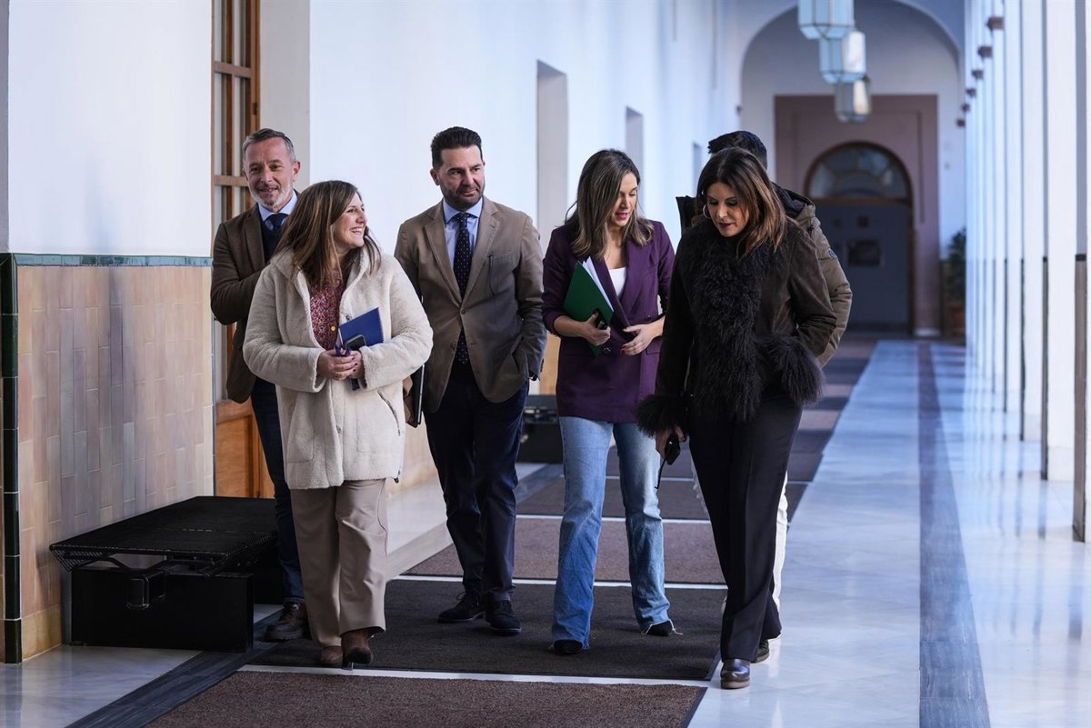 La vicesecretaria general del PSOE-A y portavoz parlamentaria, María Márquez (2d), atiende a medios antes de la celebración de la Diputación Permanente en el Parlamento andaluz. A 12 de enero de 2026, en Sevilla (Foto de archivo). - Joaquin Corchero - Europa Press