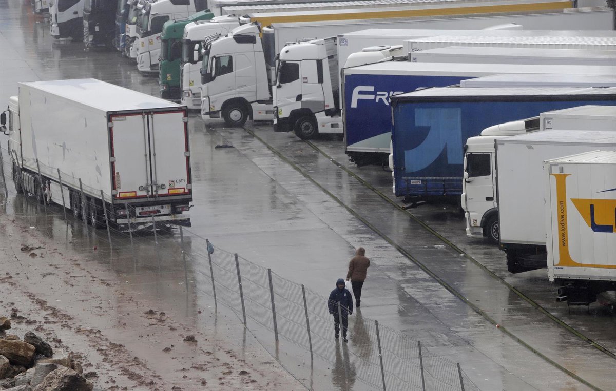Imagen de camiones parados en los accesos al puerto de Algeciras cerrados tras la cancelación de todas las conexiones marítimas con Ceuta y Tánger debido a las condiciones adversas generadas por la borrasca ‘Joseph’. A 27 de enero de 2026, en Algeciras. - Nono Rico / Europa Press