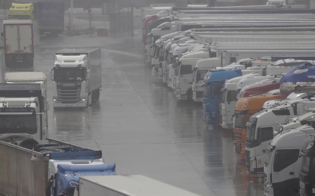 Imagen de camiones parados en los accesos al puerto de Algeciras cerrados tras la cancelación de todas las conexiones marítimas con Ceuta y Tánger debido a las condiciones adversas generadas por la borrasca. - Nono Rico / Europa Press