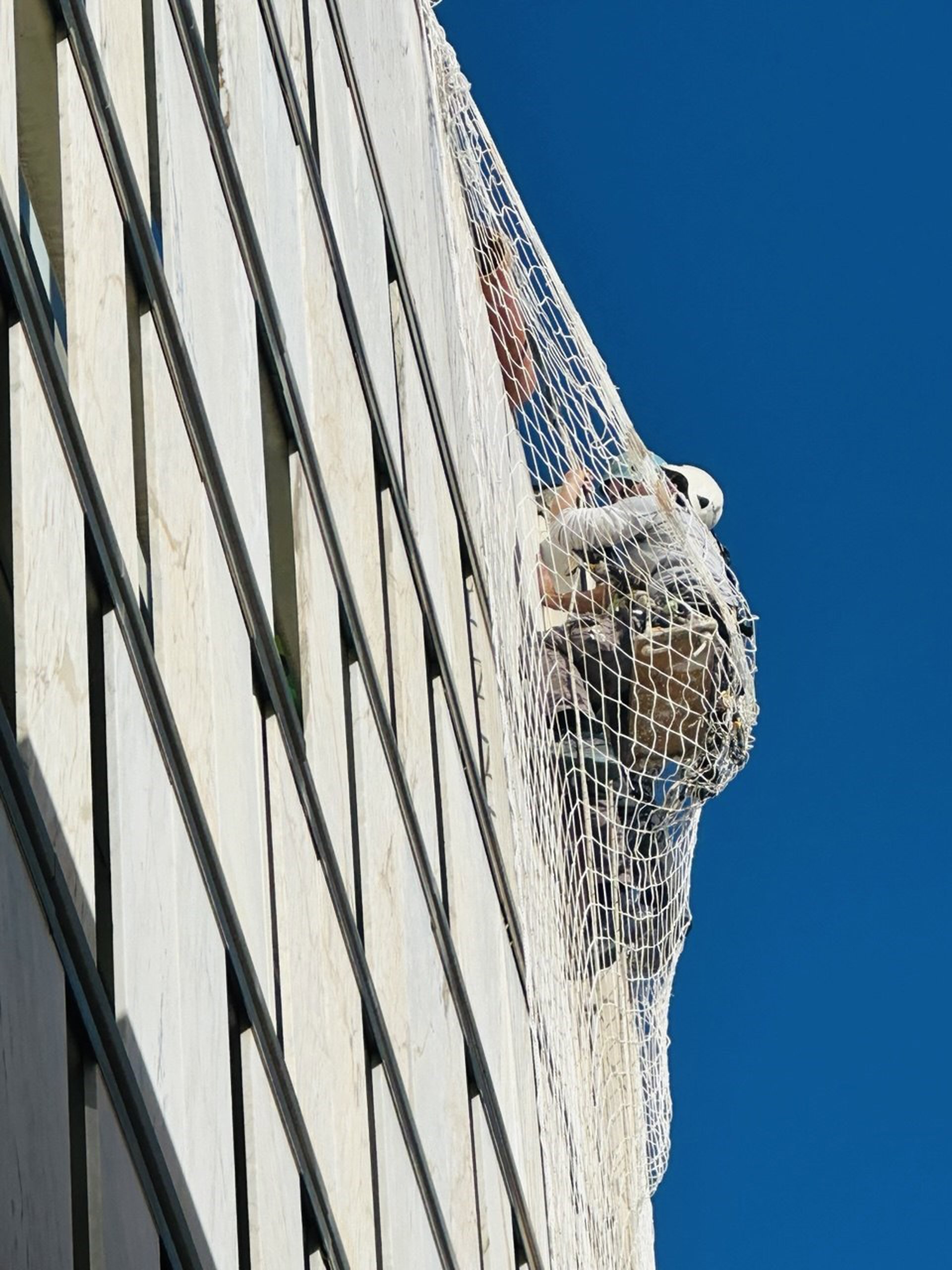 Un trabajador municipal trabaja en la retirada de placas de marmol en mal estado en el edificio del Ayuntamiento de El Puerto de Santa María. - AYUNTAMIENTO DE EL PUERTO
