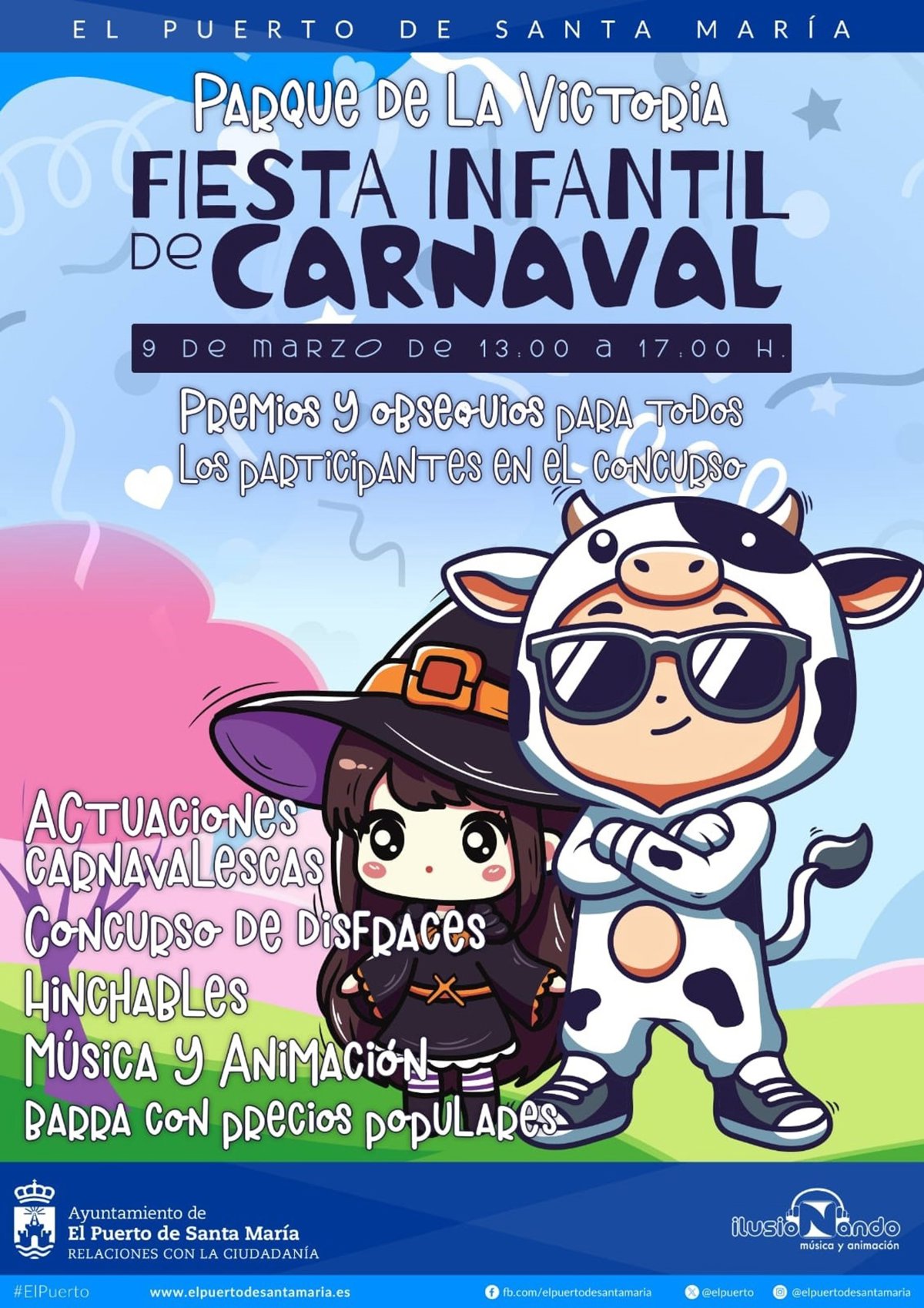 El Ayuntamiento de EL Puerto de Santa María (Cádiz) ha anunciado este viernes que el Parque de La Victoria acogerá el próximo 9 de marzo una fiesta infantil para celebrar el Carnaval, de 13,00 a 17,00 horas, "donde los más pequeños podrán disfrutar de una tarde con actuaciones carnavalescas, concurso de disfraces, hinchables, música y animación en un ambiente festivo y lleno de color".