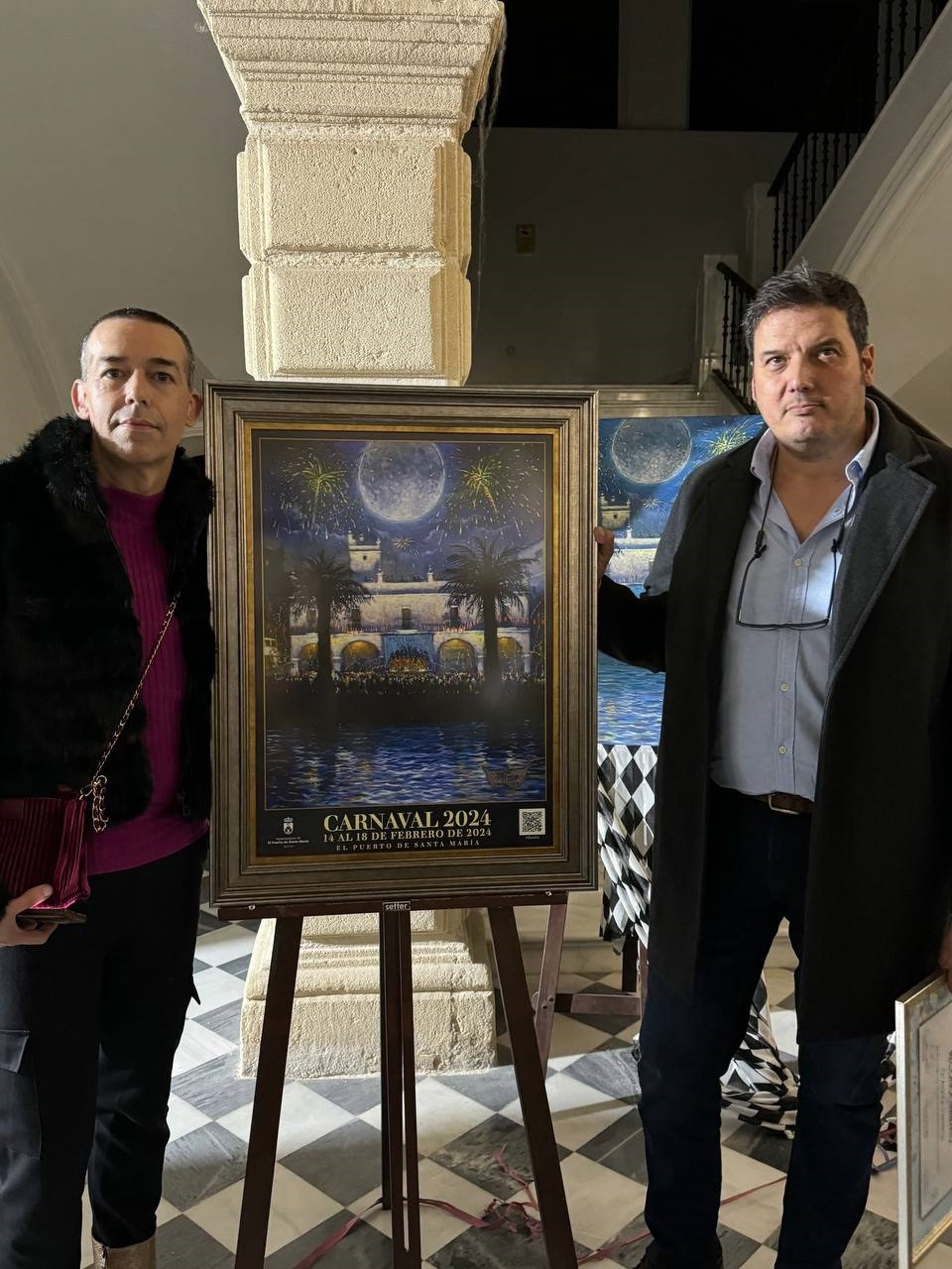 El teniente de alcalde de Fiestas del Ayuntamiento de El Puerto de Santa María, David Calleja, ha descubierto el cartel del Carnaval 2024 de El Puerto de Santa María, que se extenderá del 14 al 18 de febrero, junto al autor de la obra, Adrián Ferreras, en un acto que ha acogido el Palacio de Purullena.