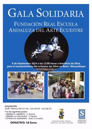 En una nota de prensa, Siloé indica que las instalaciones de la Real Escuela Andaluza del Arte Ecuestre volverán a llenarse de personas dispuestas a contribuir a los proyectos de Siloé en Mozambique y a disfrutar con el espectáculo de la Real Escuela Andaluza del Arte Ecuestre.