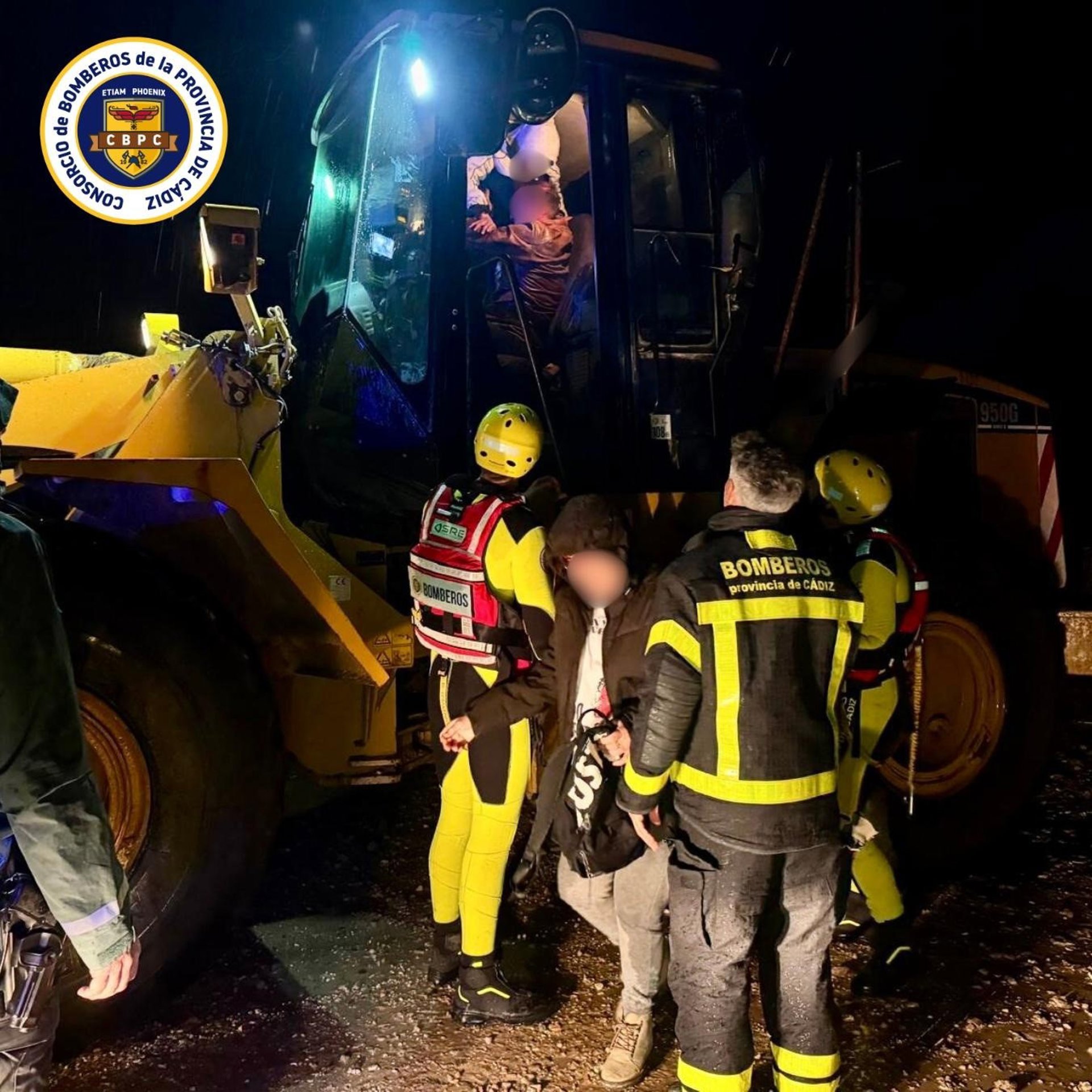 Los bomberos de Chiclana tuvieron que ayudarse de una embarcación del equipo de rescate acuático del parque de Cádiz y de una retroexcavadora con la que colaboró un operario y con la que se pudo cruzar el río para que los rescatados pudieran subirse a este vehículo pesado para ser trasladadas a un lugar seguro.