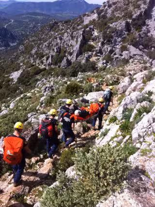 Finalmente, localizaron al herido a las 14,00 horas en El Saltillo y, una vez inmovilizado, los bomberos lo trasladaron a pie en camilla por una pendiente descendente, durante cuatro kilómetros y 200 metros por un desnivel de 400 metros hasta la zona recreativa de Agua Nueva, donde esperaba una ambulancia que lo trasladaría al Hospital de Ronda.