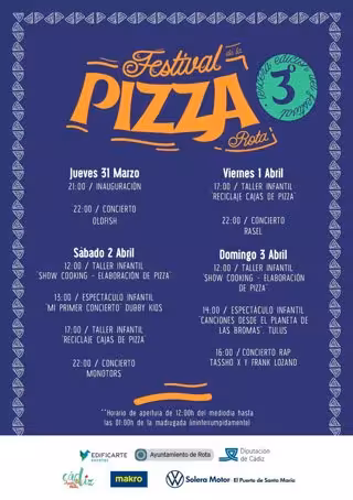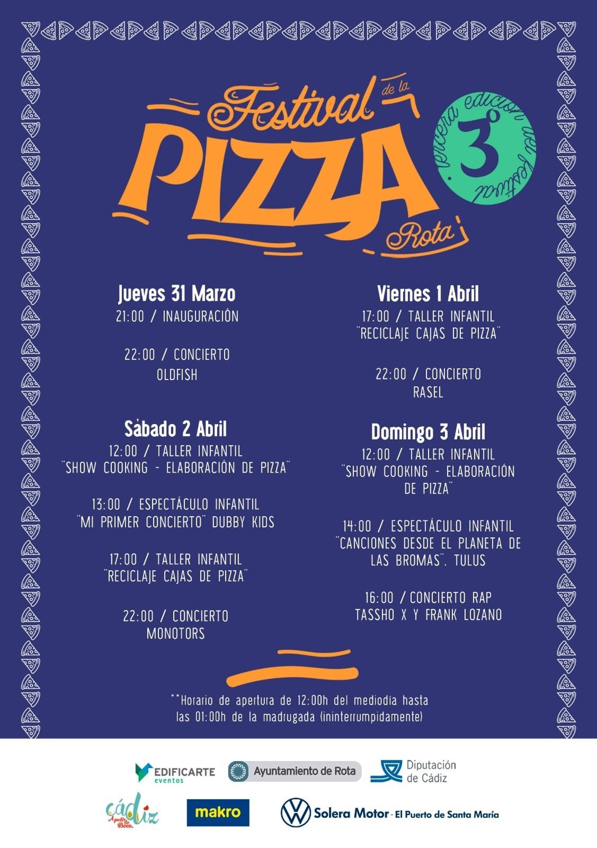 El festival cuenta con la participación de las pizzerías 'Gallego', 'Villa de Rota', 'Slice', 'El Perejil', 'Domino's' y 'La Martina', y permanece abierto de 12,00 a 00,00 horas de manera ininterrumpida.