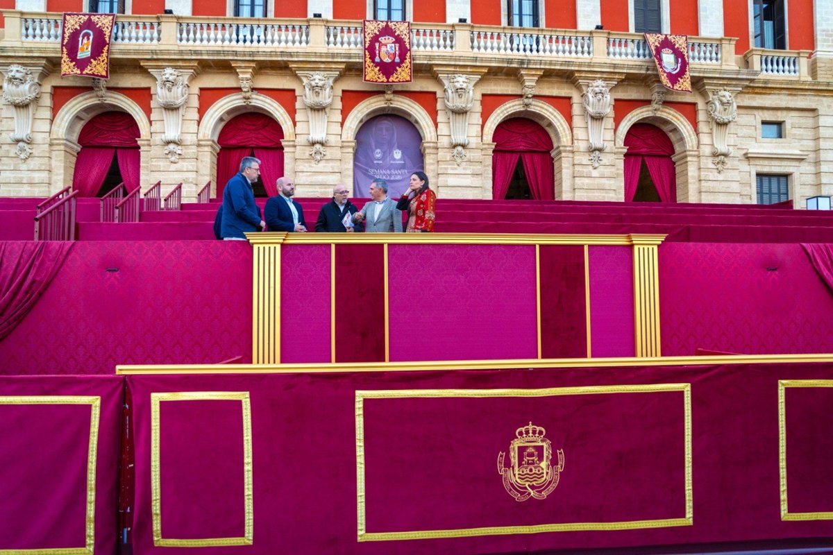 Asimismo, los ventanales de la primera planta del edificio consistorial han sido iluminados. Este conjunto se completa con la colocación de banderolas, telas decorativas y la disposición de los palcos a lo largo de la Plaza del Rey.