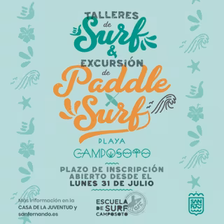 El Ayuntamiento de San Fernando pone en marcha durante el mes de agosto seis talleres de surf (dos sesiones diarias de 1,5 horas de duración) y dos excursiones de una hora de duración cada una de paddle board.