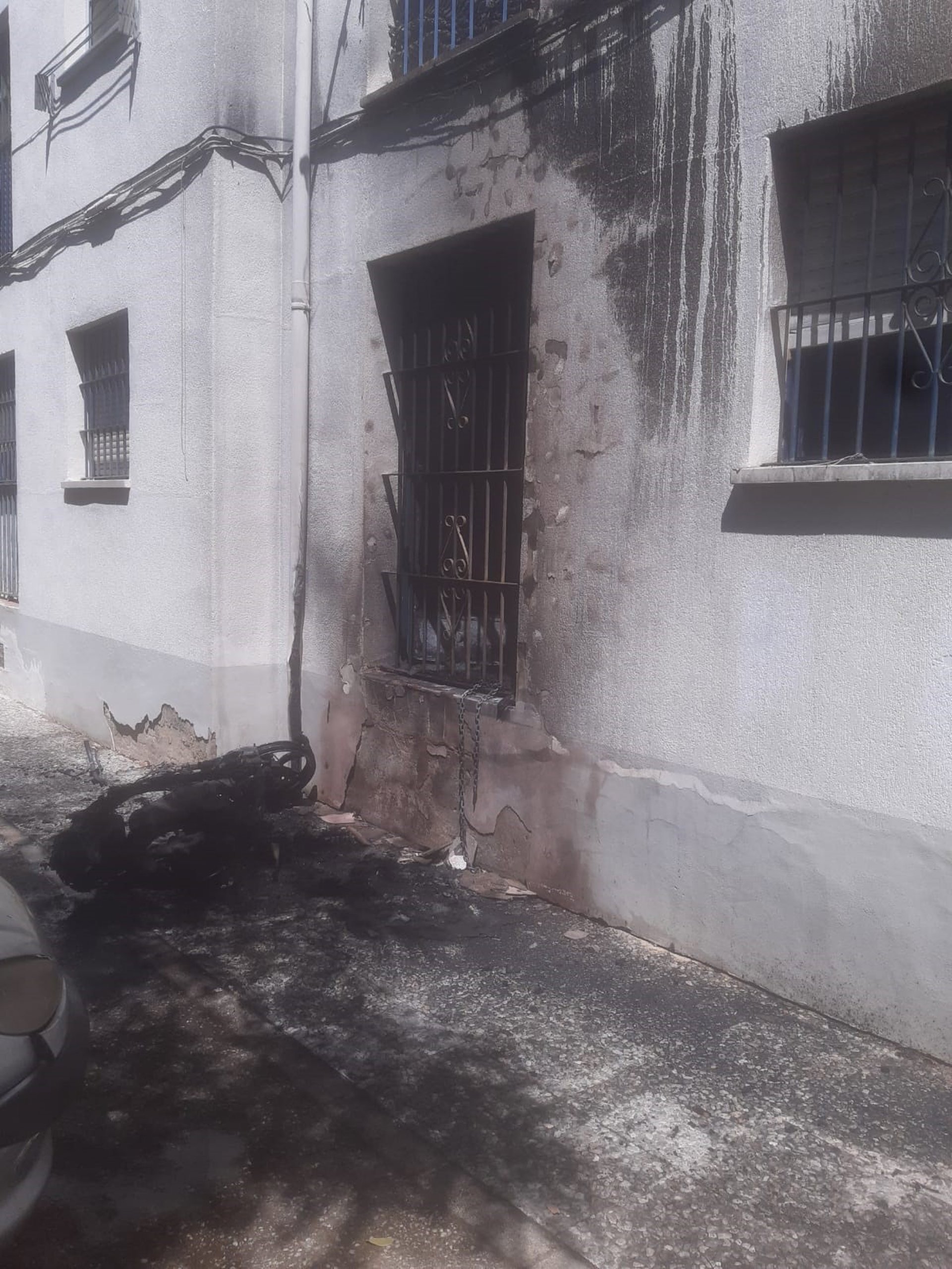 Los efectivos, tras llegar al lugar de los hechos, han observado cómo una la moto estaba atada con un candado a la reja del bajo de esta vivienda ha provocado el incendio que ha afectado al inmueble.