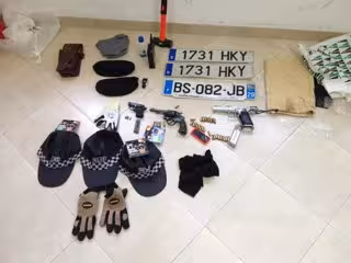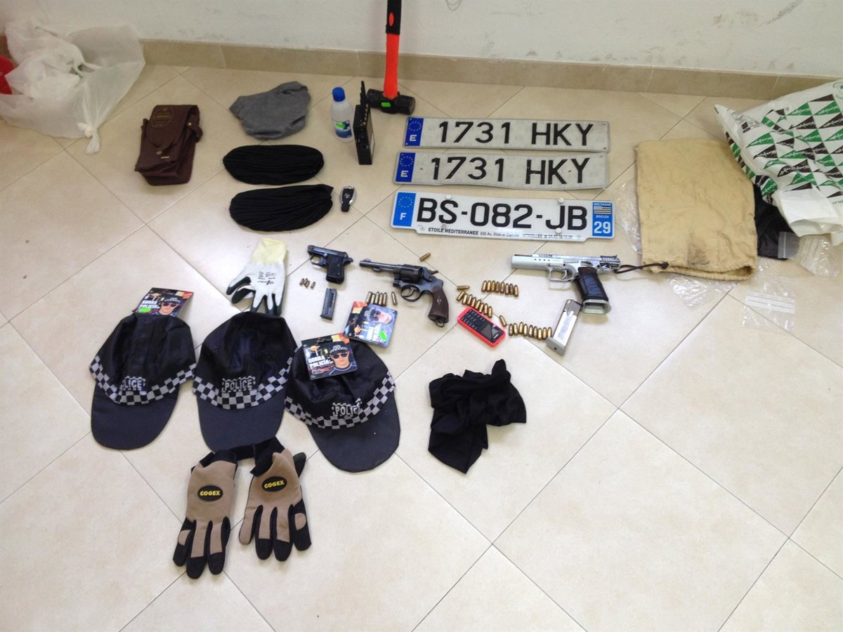 En el vehículo abandonado, con placas de matrícula falsificadas y que fue sustraído en el año 2014 en Altea (Alicante), se localizó la pistola del calibre 22, con cuatro cartuchos en el cargador; seis cartuchos del 38 mm; una gorra con la inscripción de policía y tres placas de matrículas. En las cercanías del vehículo también fue intervenido un inhibidor de frecuencias, 18 cartuchos del calibre 9 milímetros y cuatro pasamontañas.