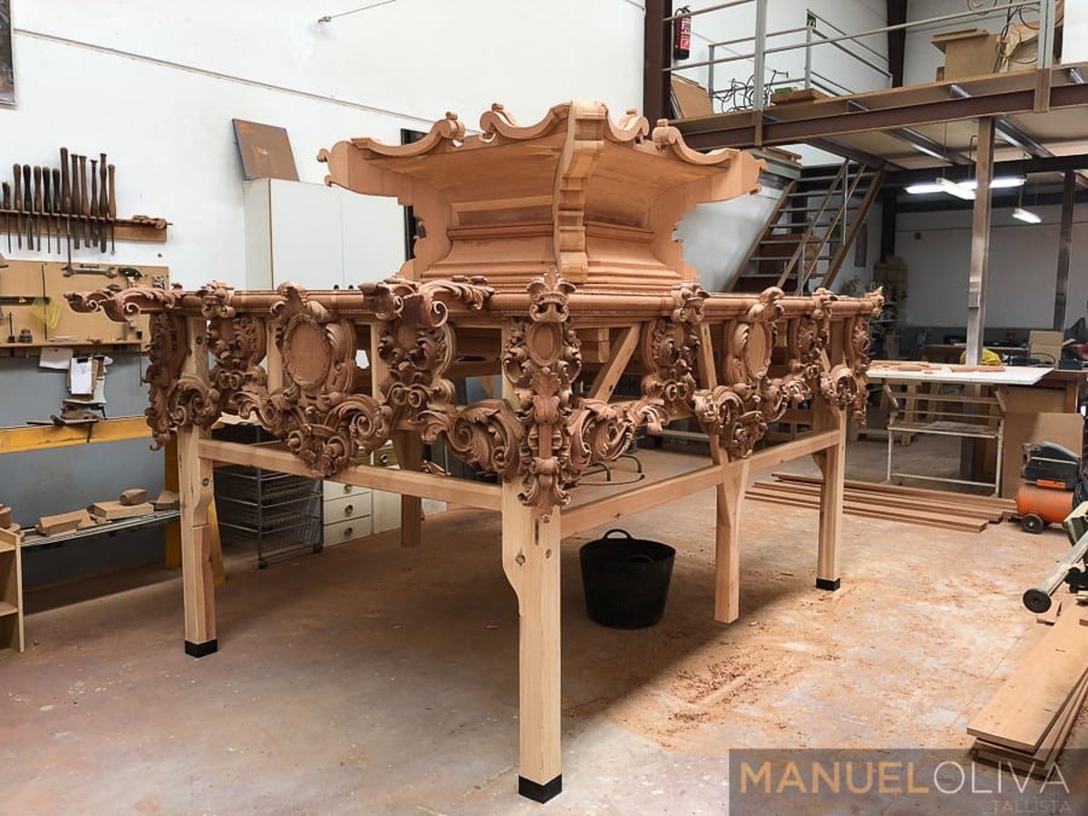 A partir de ahí, se elabora un diseño a escala que la hermandad presenta a sus hermanos y, si es aprobado, se lleva a la realidad. Primero se construye la estructura en carpintería y, posteriormente, la talla se desarrolla por fases, año a año, en función de la economía de cada hermandad.