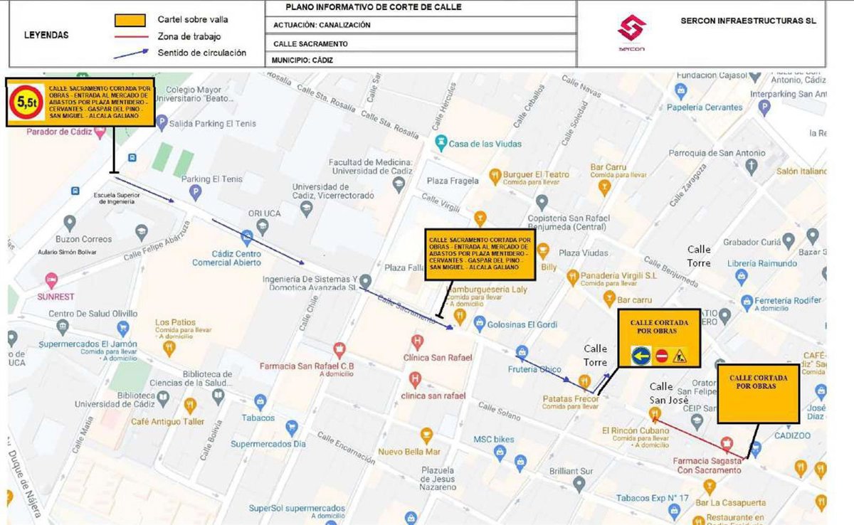 Al quedar la calle Sacramento cortada en el punto indicado, el acceso al Mercado de Abastos se llevará a cabo mediante la plaza del Mentidero, calle Cervantes, calle Gaspar del Pino, calle San Miguel y calle Alcalá Galiano, recordando que este acceso está limitado a vehículos de menos de 5,5 toneladas.