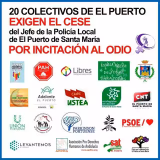 Un total de 20 colectivos y organizaciones han firmado un manifiesto conjunto en el que se exige el cese inmediato del actual cargo como Jefe de la Policía Local de El Puerto de Santa María (Cádiz), Rafael Muñoz Leonisio, "por su constante incitación al odio, sus continuos insultos públicos homófobos y machistas, y su apología del fascismo, haciendo alusión a líderes falangistas como Primo de Rivera".