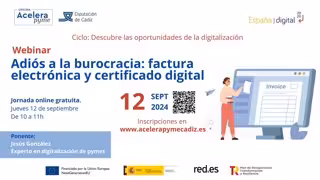 La Oficina Acelera Pyme 'Cádiz.es Digital', que administra Diputación a través de Epicsa y el Instituto de Empleo y Desarrollo Socioeconómico y Tecnológico (IEDT), impartirá el próximo jueves 12 de septiembre el webinar 'Adiós a la burocracia: factura electrónica y certificado digital', diseñado para pequeñas y medianas empresas, emprendedores, autónomos y negocios de las zonas rurales.