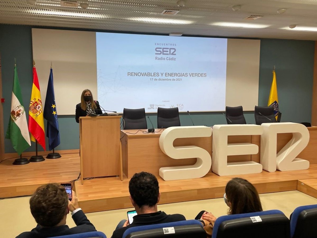 La presidenta de Diputación, Irene García, ha participado en la jornada 'Renovables y energías verdes' que ha organizado la Cadena SER en la Facultad de Ciencias sita en el campus de la Universidad de Cádiz en Puerto Real, donde ha reclamado una estrategia regional que aporte certidumbre y seguridad jurídica ante la diversidad de proyectos de energías renovables.