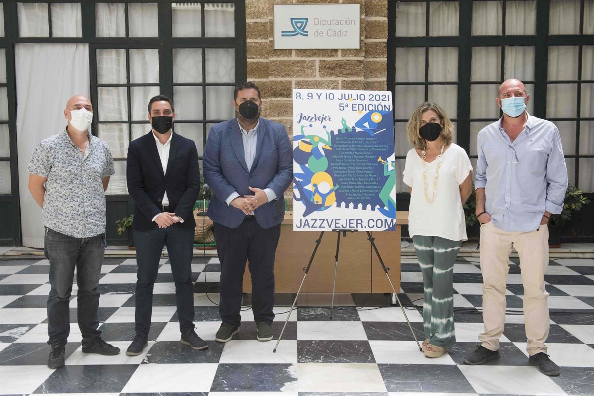 El Festival Jazz Vejer celebra su quinta edición en este 2021 con el apoyo de la Diputación de Cádiz. Los diputados de Desarrollo de la Ciudadanía y de Cultura, Jaime Armario y Antonio González Mellado, respectivamente, han acompañado este lunes a los organizadores de la iniciativa, Nacho Corral y Francisco Muñoz, en la presentación de la misma en el Palacio Provincial. El acto ha contado también con la presencia de la delegada de Cultura de Vejer, Francisca Sánchez.