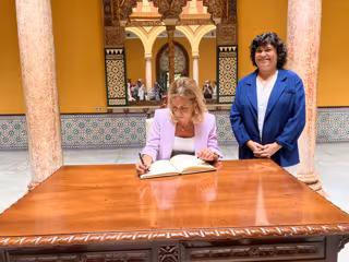 La presidenta de Diputación de Cádiz, Almudena Martínez, firma en el Libro de Honor del Ayuntamiento de Sanlúcar de Barrameda, junto a su alcaldesa Carmen Álvarez - DIPUTACIÓN DE CÁDIZ