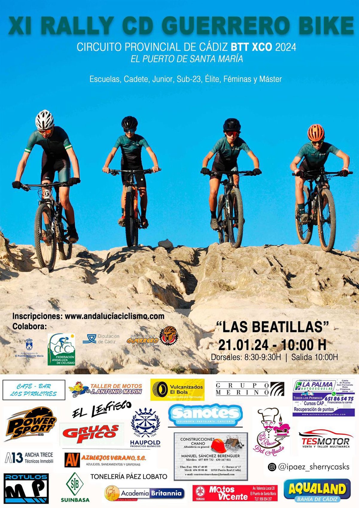 La XI Rally C.D. Guerrero Bike es la primera carrera de una temporada en la que hay programadas ocho pruebas en el caso de escuelas y cinco para categorías a partir de cadete. Las localidades de Medina Sidonia, Trebujena, Jerez de la Frontera, Estella del Marqués, Chiclana de la Frontera, Guadalcacín y nuevamente Trebujena, con citas entre los meses de enero y mayo, serán las siguientes paradas. La más cercana es el 'VII Rally Ciudad de Medina Sidonia' del sábado 27 de enero, puntuable también para Copa de Andalucía y cuyas inscripciones están igualmente disponibles.