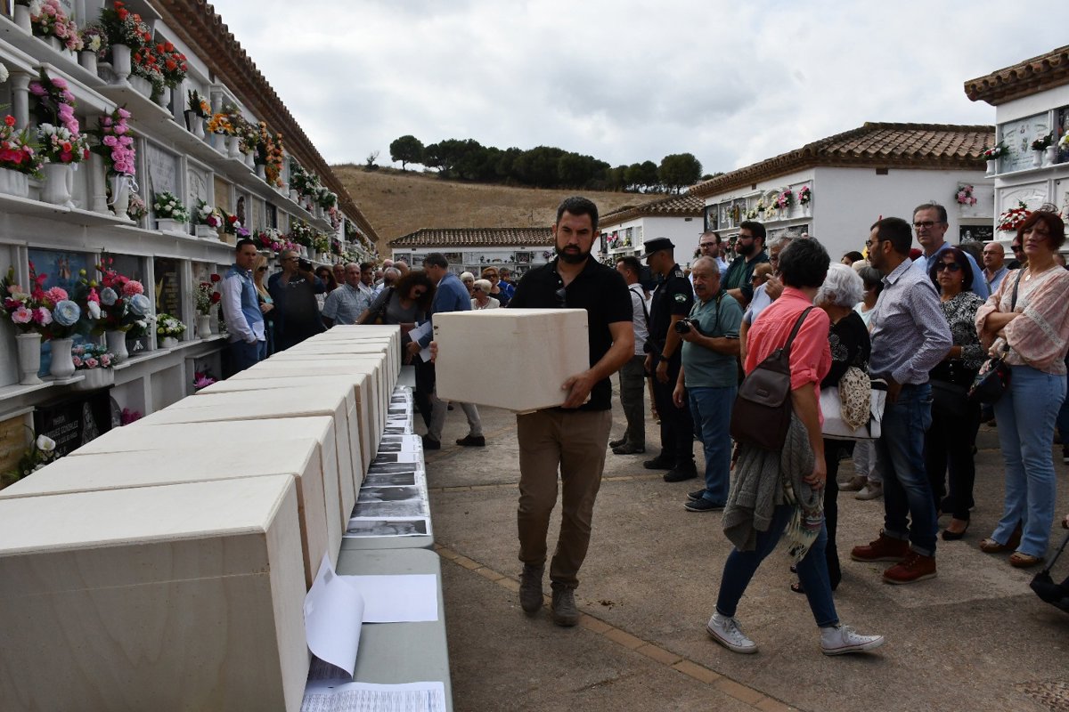 Los restos de 19 personas que fueron exhumadas desde fosas comunes ya reposan en un conjunto de nichos del cementerio de Jimena de la Frontera (Cádiz), cerca de San Pablo de Buceite.