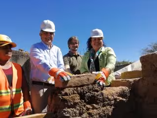 El embajador de España en El Salvador, Federico de Torres Muro, la alcaldesa de Suchitoto, Pedrina Rivera Hernández, y el coordinador de la Agencia Andaluza de Cooperación Internacional para el Desarrollo (Aacid) para El Salvador, Guatemala y SICA, Javier Serrano Puente, han colocado el 'Primer Adobe' que ha dado inicio a las obras de rehabilitación del edificio histórico del ExRastro Municipal de Suchitoto para su transformación en el Centro Cultural y de Convivencia Ciudadana.