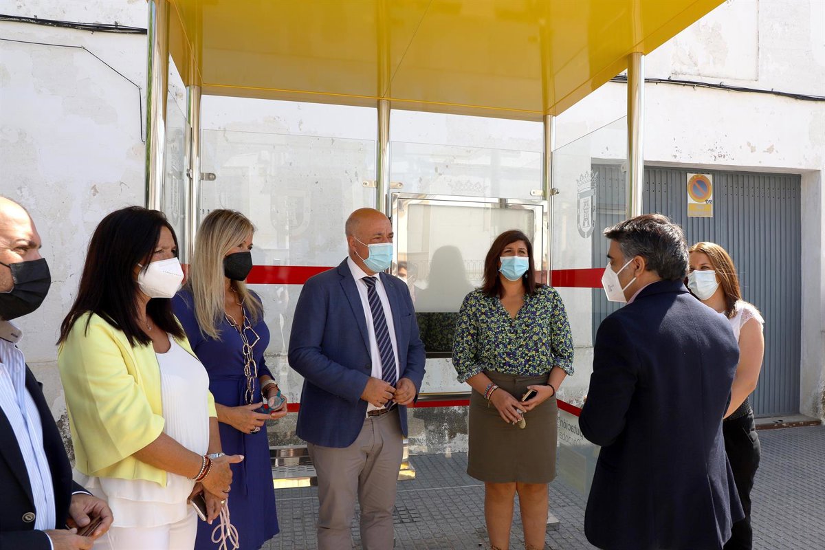 El presidente de la Diputación de Córdoba, Antonio Ruiz (centro), en una de las nuevas marquesinas instaladas en Bujalance. - DIPUTACIÓN DE CÓRDOBA