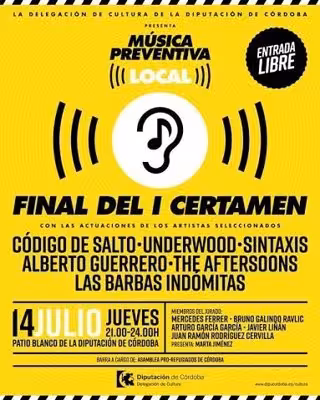 El patio blanco de la Diputación de Córdoba acoge este jueves, a partir de las 21,00 horas, la actuación de los seis grupos y artistas seleccionados para la final del I Certamen de Música Preventiva para Bandas y Artistas de la provincia 'Local', impulsado por la Delegación de Cultura de la institución provincial.