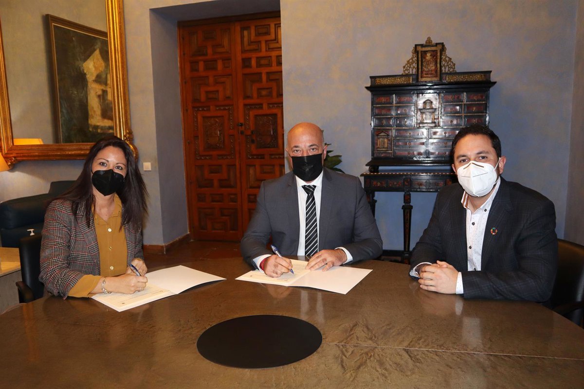 El presidente de la Diputación de Córdoba, Antonio Ruiz (centro), firma el acuerdo con la alcaldesa de Fuente Obejuna, Silvia Mellado. - DIPUTACIÓN DE CÓRDOBA