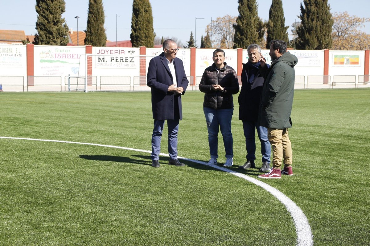 El delegado de Cohesión Territorial de la Diputación de Córdoba, Juan Díaz, ha visitado el municipio de Hinojosa del Duque, donde ha podido comprobar junto a su alcalde, Matías González, el estado de las actuaciones que han permitido la sustitución del césped artificial del campo de fútbol de la localidad así como la mejora de las instalaciones deportivas.