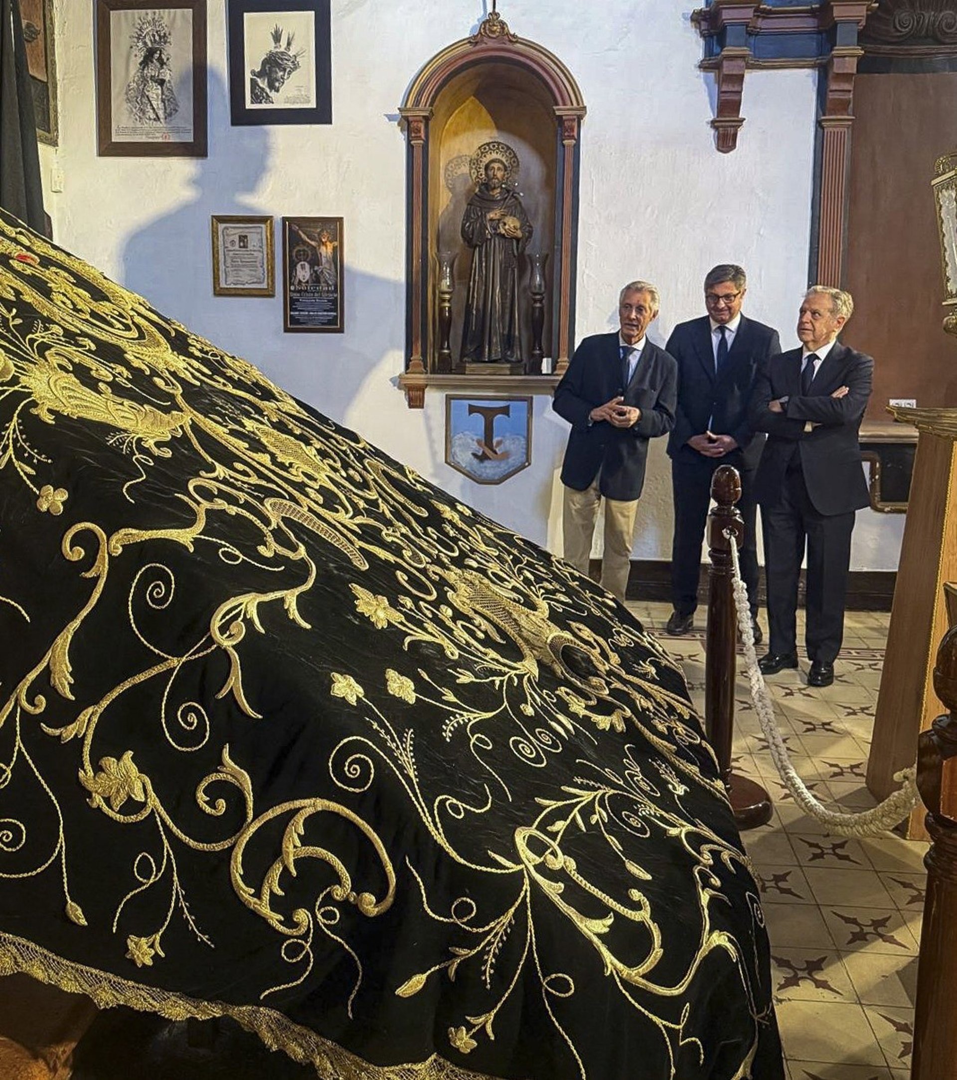 Salvador Fuente (dcha.) observa el manto procesional de la Virgen de La Soledad de Puente Genil ya restaurado. - DIPUTACIÓN DE CÓRDOBA