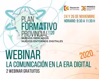 El Instituto Provincial de Desarrollo Económico (Iprodeco) de la Diputación de Córdoba ofrecerá los próximos días 24 y 26 de noviembre, en horario de 9,30 a 11,30 horas, un webinar gratuito sobre 'La comunicación en la era digital', dirigido a empresarios, emprendedores, trabajadores por cuenta ajena, consultores y asesores cordobeses que busquen aprender a desarrollar una estrategia de comunicación para aplicarla en su empresa.