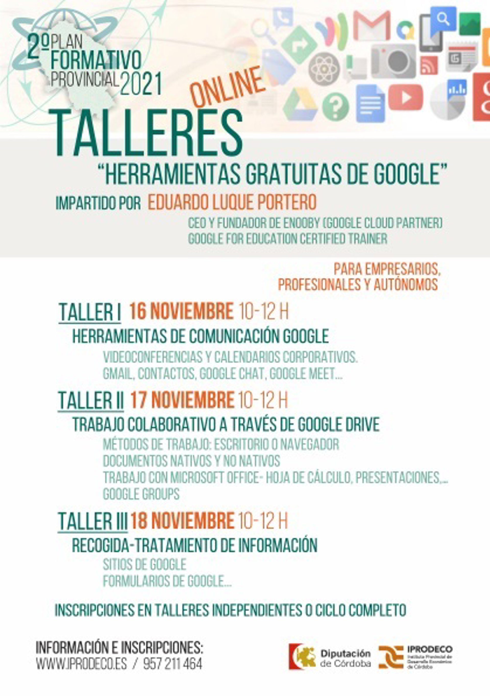 El Instituto Provincial de Desarrollo Económico (Iprodeco) de la Diputación de Córdoba pone en marcha un nuevo ciclo de talleres online de transformación digital, en esta ocasión centrado en las 'Herramientas gratuitas de Google', una propuesta que se desarrollará los días 16, 17 y 18 de noviembre en formato 'webinar'.