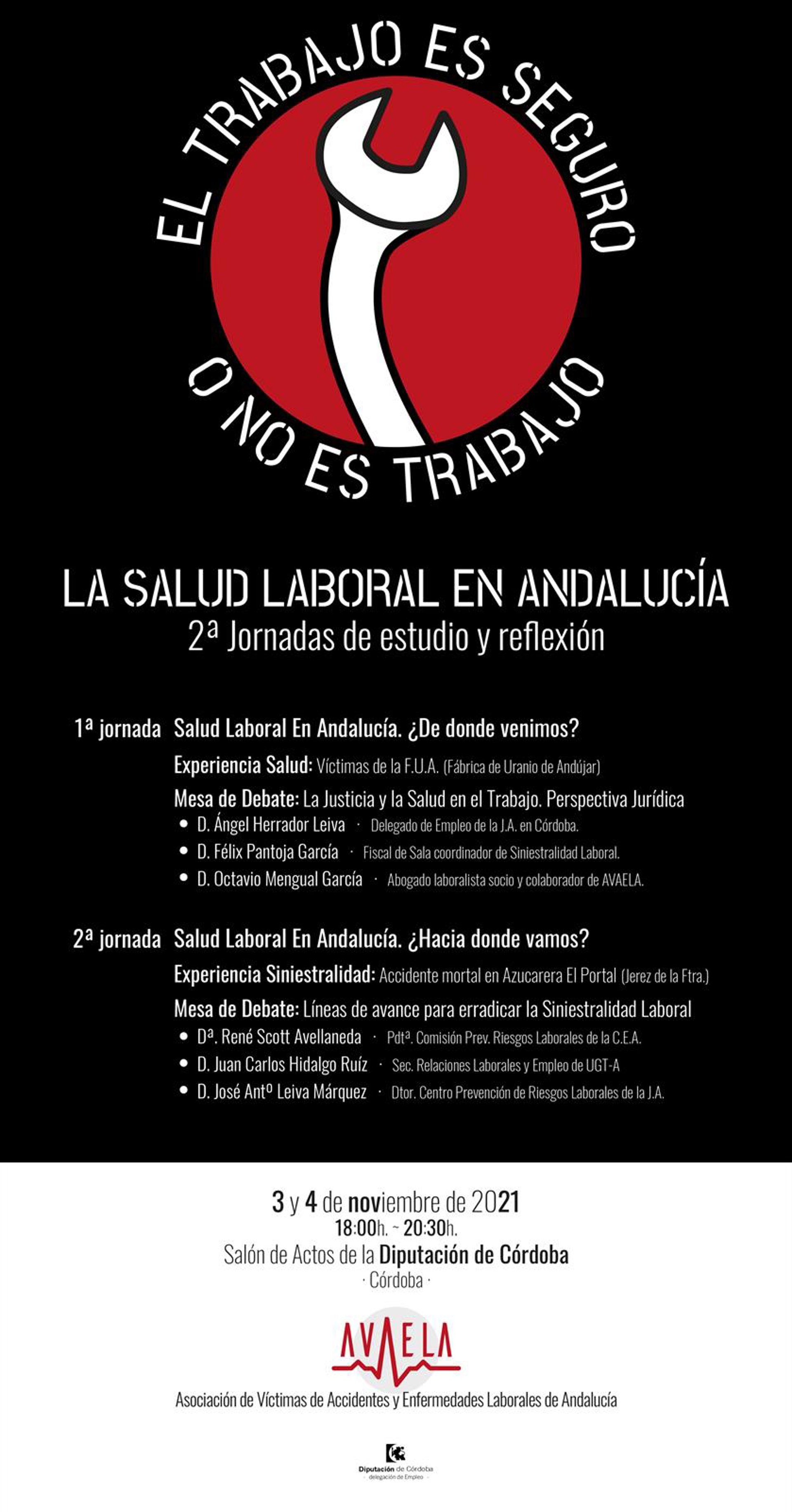 En el segundo día de las jornadas, el jueves 4 de noviembre, se analizarán las iniciativas y líneas de avance necesarias para erradicar la siniestralidad y la falta de salud laboral en Andalucía. Además, se expondrá la experiencia concreta de un familiar de una víctima de accidente laboral y habrá un debate sobre 'Herramientas para erradicar la siniestralidad y la falta de salud laboral. Líneas de avance para superar este problema'. Las jornadas concluirán con un recorrido por la trayectoria de Avaela durante todo este tiempo.