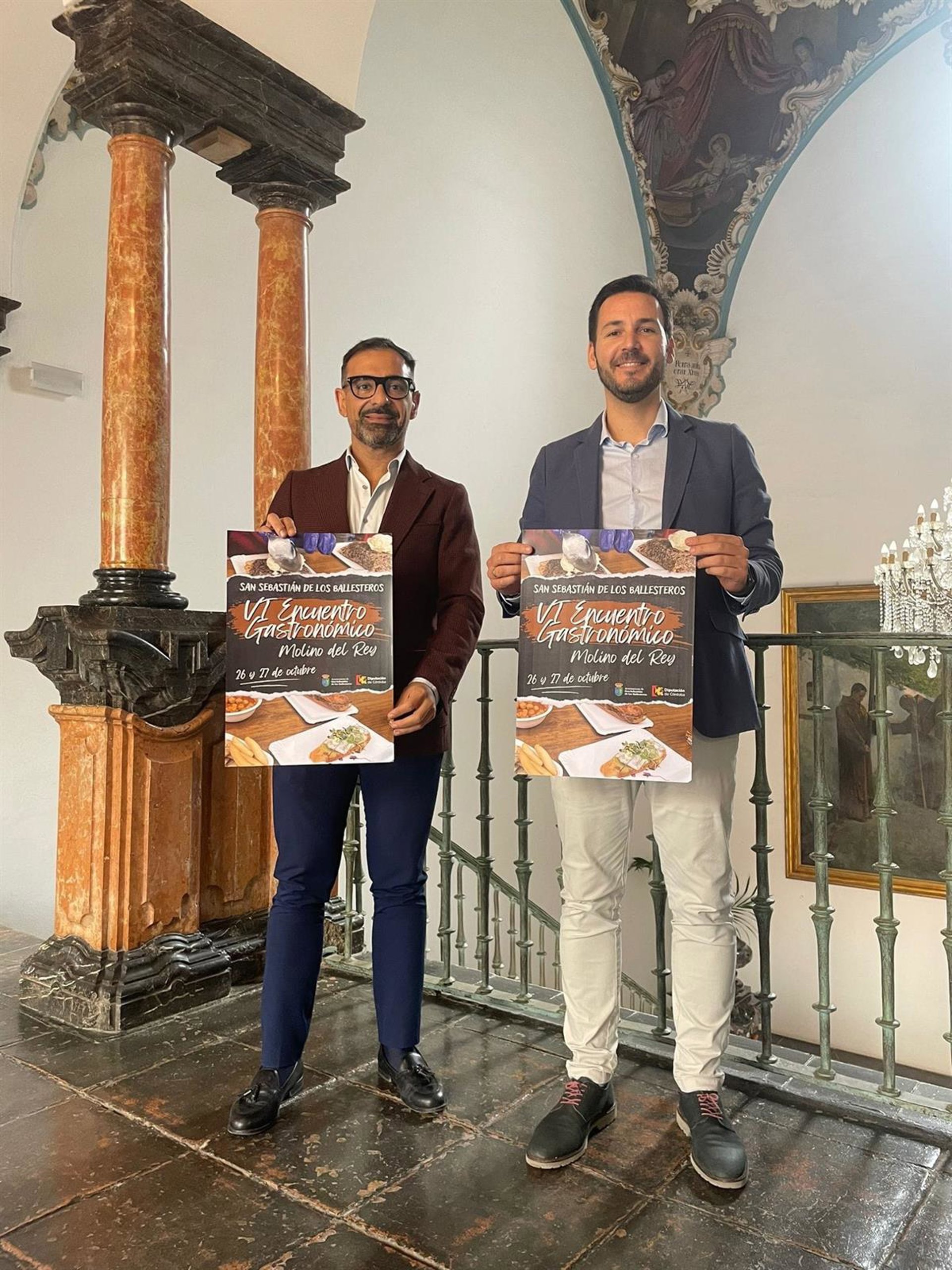 El delegado de Desarrollo Económico, Promoción y Empleo de la Diputación de Córdoba, Félix Romero, acompañado por el alcalde del municipio, Francisco Javier Maestre, en la presentación del VI Encuentro Gastronómico Molino del Rey - DIPUTACIÓN DE CÓRDOBA