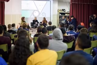 Antes de presentar su documental, Francisco Rodríguez ha participado en una mesa redonda en el IES 'Albaida' junto con los estudiantes de los ciclos formativos de Realización de Audiovisuales, Producción, Vídeo y Sonido. Los jóvenes han preparado una auténtica 'premiére', con 'photocall', posado, declaraciones y grabación del coloquio, en el que han podido conocer los detalles de esta edad dorada del cine en la provincia.