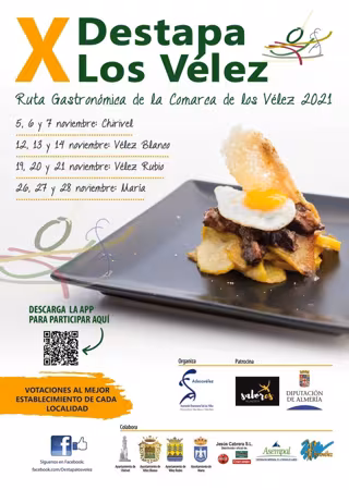 Las rutas de esta décima edición se desarrollarán durante cuatro fines de semana. Del 5 al 7 de noviembre, en Chirivel; del 12 al 14 de noviembre se celebrará en Vélez Blanco; del 19 al 21, en Vélez Rubio y del 26 al 28 de noviembre, en María. La ruta 'Destapa Los Vélez' ofrece un paseo culinario a través de la gastronomía de la Comarca, que sorprende a los visitantes.