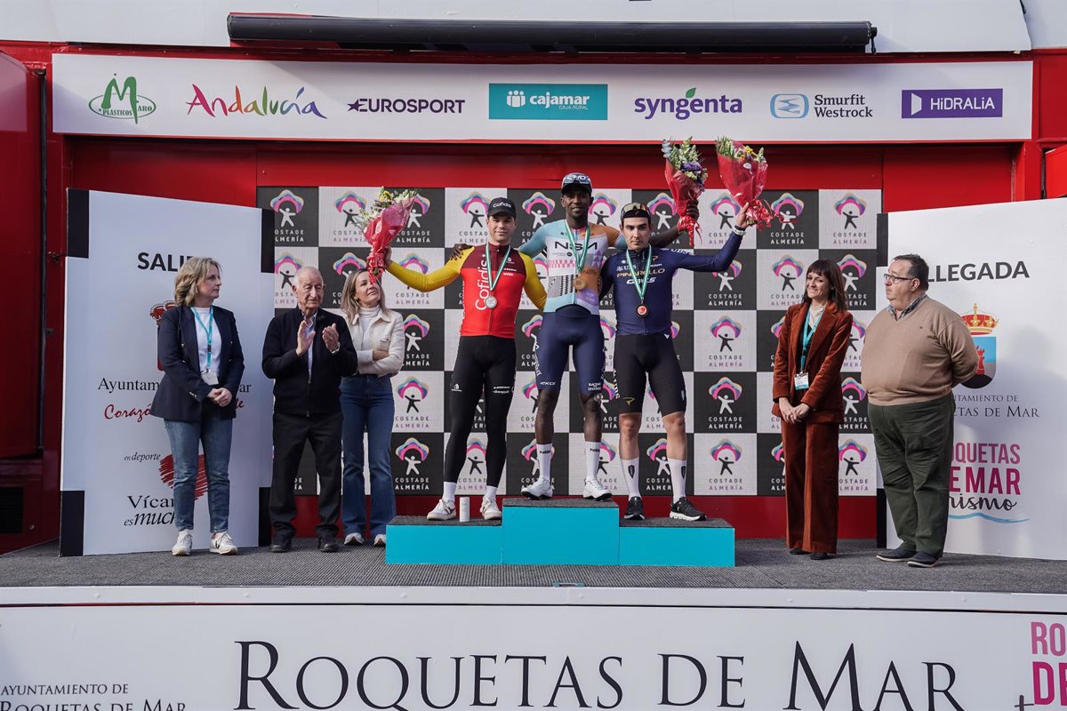 Imagen de este domingo del podio de la 39 edición de la Clásica Ciclista de Almería, que ha acabado en Roquetas de Mar. - CURRO VALLEJO/DIPUTACIÓN DE ALMERÍA
