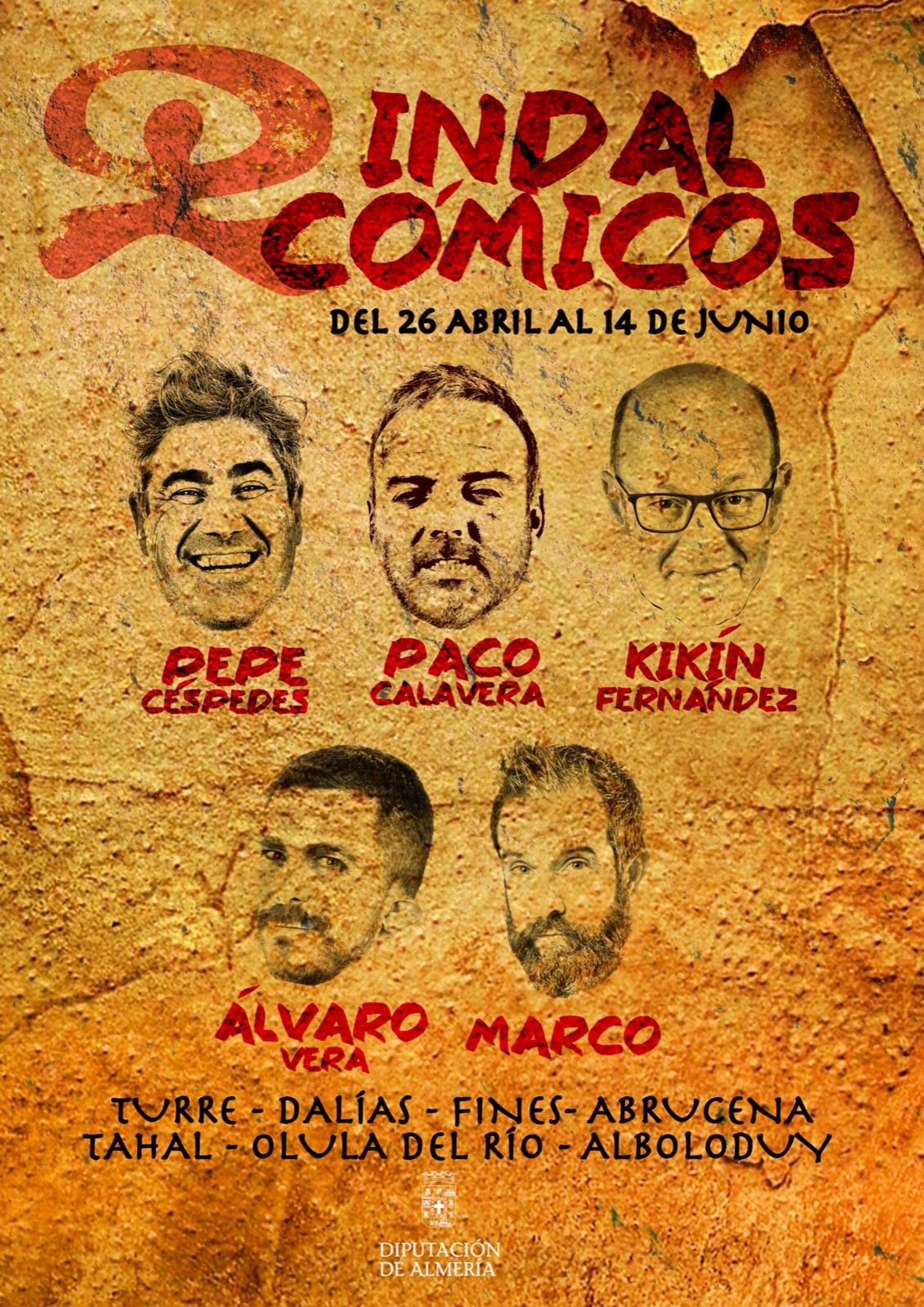 La Diputación Provincial de Almería va a acercar el humor almeriense a siete municipios de la provincia de Almería a través del Circuito 'Indalcómicos'; una iniciativa que permitirá a los vecinos de Turre, Dalías, Fines, Abrucena, Tahal, Olula del Río y Alboloduy ser sede de las actuaciones de Kikín, Alvarito, Pepe Céspedes y Paco Calavera entre los meses de abril y de junio.