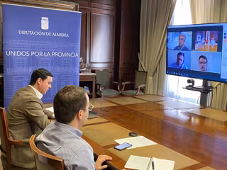 El presidente de la Diputación de Almería, Javier Aureliano García, y el diputado de Presidencia, Fernando Giménez, han participado en la videoconferencia con el director de la UPT Litoral de Almería, Juan Luis Redondo, así como con Juan Álvarez Abelló, responsable de Desarrollo de Negocio y Rafael Sánchez Durán, responsable de Relaciones Institucionales de Endesa en Andalucía.