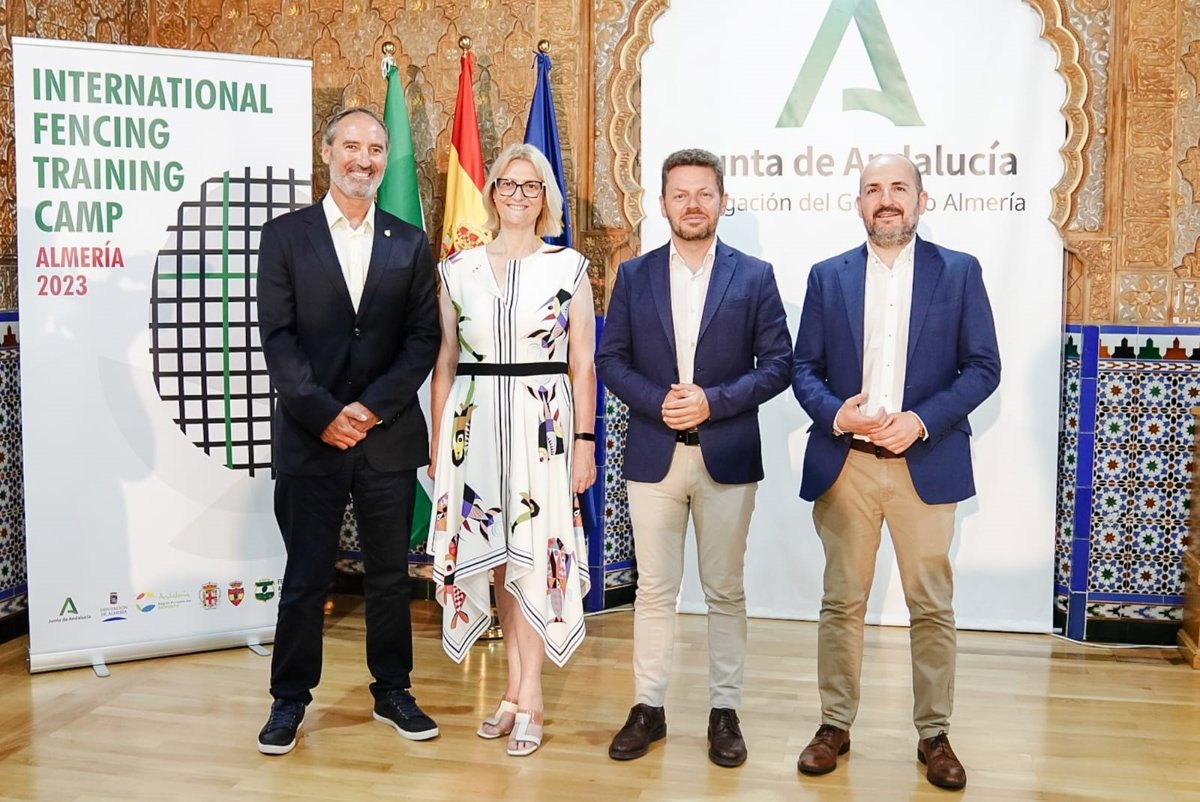 El delegado de Turismo, Cultura y Deporte, José Ángel Vélez, acompañado de la presidenta de la Federación Andaluza de Esgrima, Astrid Ferrando, el diputado Delegado Especial de Empleo, Promoción Económica, Iniciativas Europeas, Comercio y Empresa, Francisco Álvarez, el concejal de Ciudad Activa, Movilidad Urbana y Deporte, Antonio Jesús Casimiro, han sido los encargados de presentar la II Concentración Internacional de Esgrima que se va a celebrar en Almería del 8 al 18 de julio.