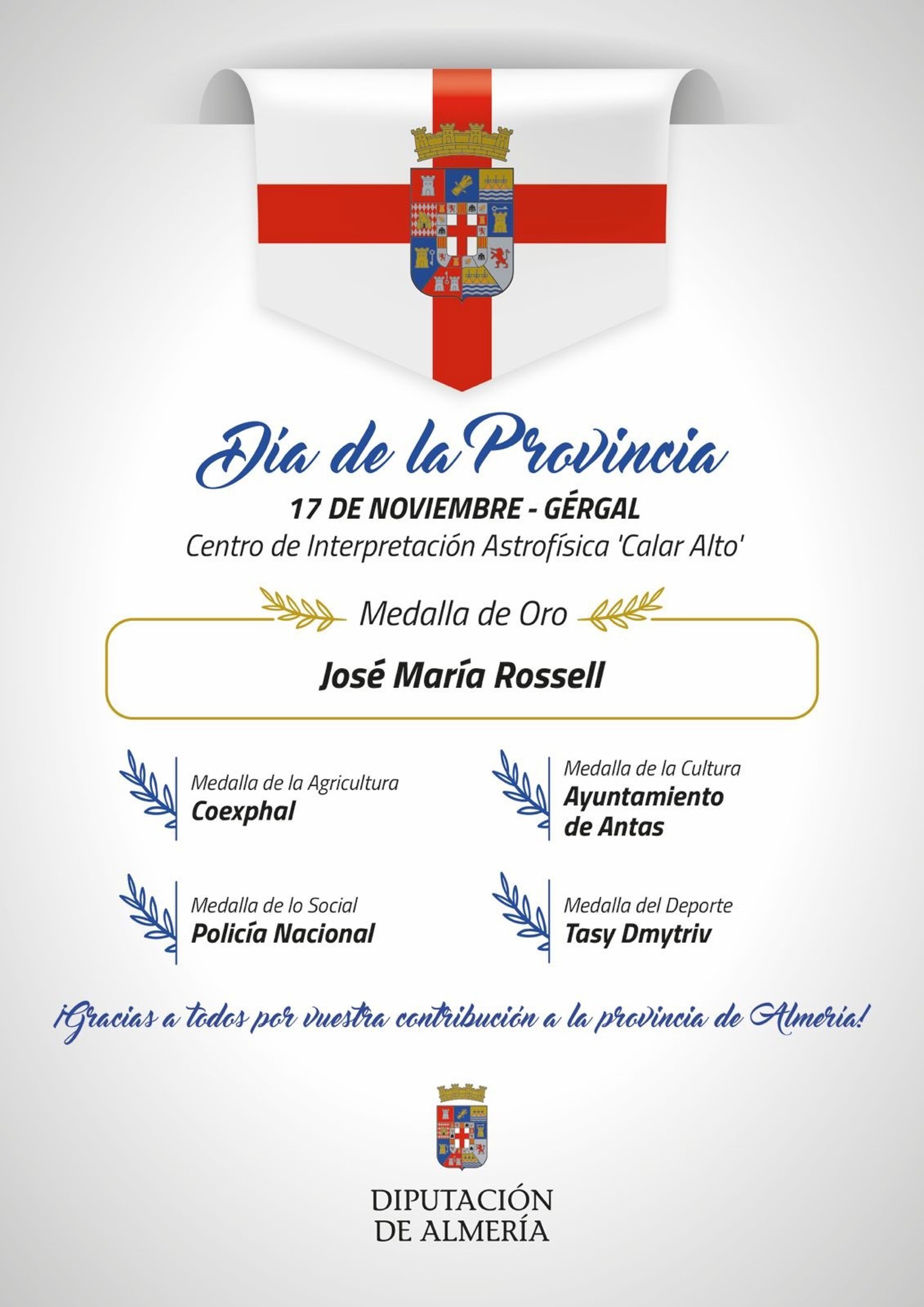 Sobre las personas y entidades que este año serán distinguidas con las medallas del Día de la Provincia, el presidente ha afirmado que "todas ellas han contribuido con su trabajo y talento, desde sus respectivos ámbitos profesionales, al desarrollo, crecimiento y prosperidad de la provincia de Almería".