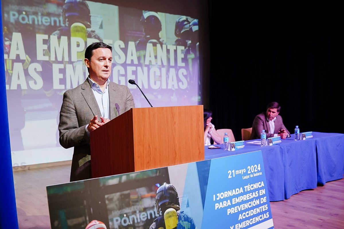 El presidente de la Diputación de Almería, Javier Aureliano García, interviene en la I jornada sobre prevención de accidentes y emergencias en el marco de la empresa. - DIPUTACIÓN DE ALMERÍA
