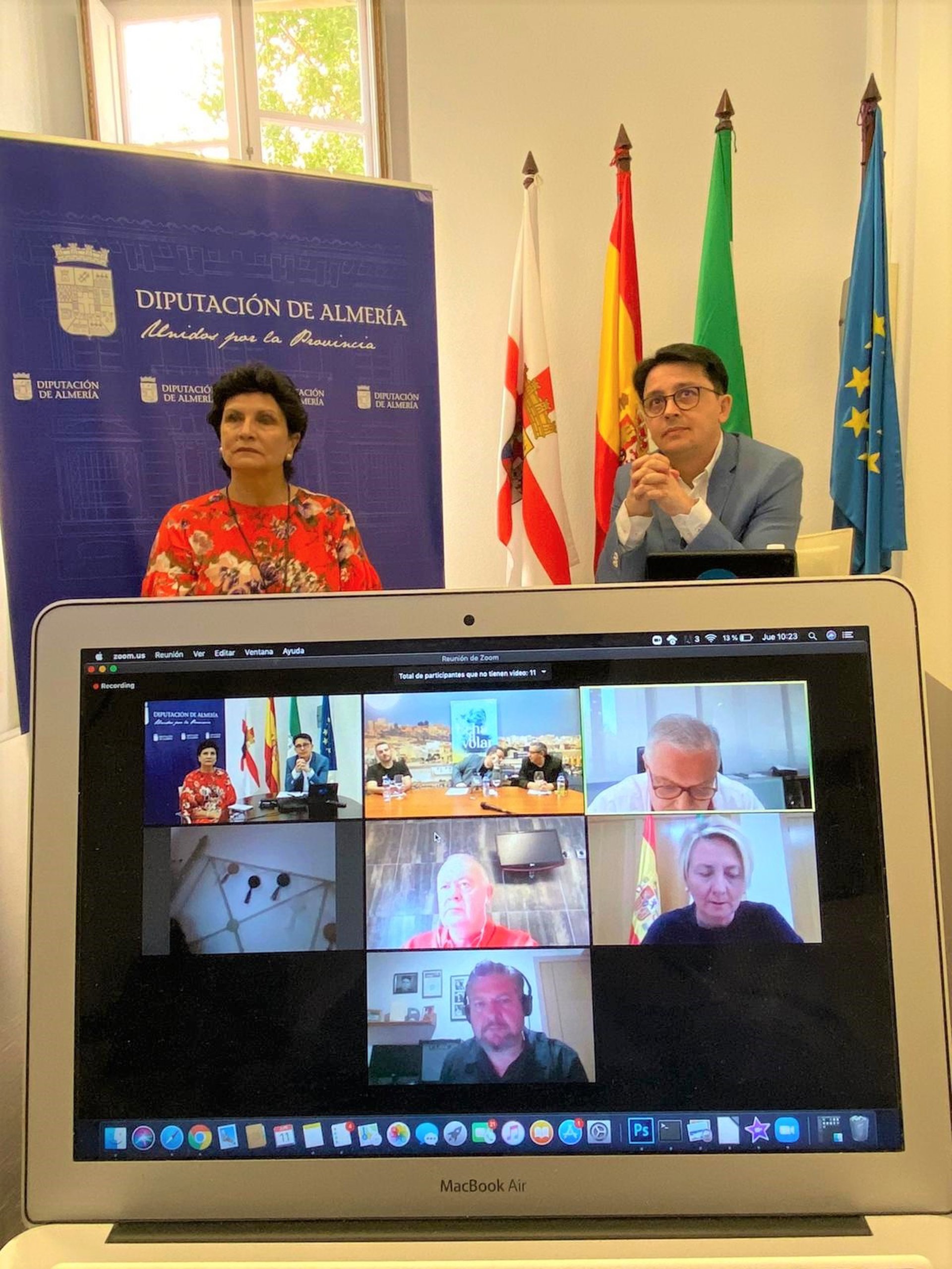 En el encuentro virtual con los medios de comunicación, a través de la plataforma Zoom, han participado el diputado de Cultura, Manuel Guzmán, el edil de Cultura, Diego Cruz, así como los delegados territoriales de la Junta de Andalucía, Emilio Ortiz y Eloísa Cabrera, la diputada de Iniciativas Europeas, Carmen Navarro, así como los responsables del Movimiento Cultural en apoyo a los artistas almerienses tras el confinamiento: Felipe Berenguel, Salvador Martínez y Sergio Núñez.