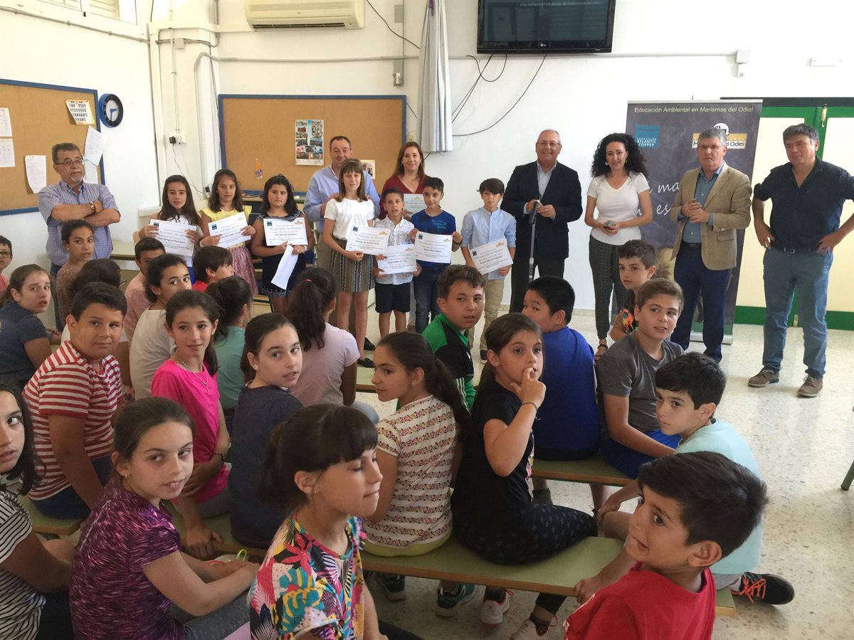 El delegado territorial de Medio Ambiente y Ordenación del Territorio de la Junta en Huelva, José Antonio Cortés, acompañado de la alcaldesa de Gibraleón, Lourdes Martín, ha entregado al Centro de Educación Infantil y Primaria (CEIP) Miguel de Cervantes de Gibraleón (Huelva) el premio correspondiente al concurso del programa 'Mi Marisma, mi escuela' de 2018.