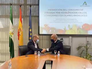 Una cooperación que ha sido renovada este jueves con la firma, por el director general de la Agencia Pública Andaluza de Educación, Manuel Cortés, y el director gerente de la Agencia de Gestión Agraria y Pesquera de Andalucía, José Carlos Álvarez, de un protocolo general de colaboración entre ambas instituciones para la promoción del consumo de productos ecológicos en los comedores escolares.