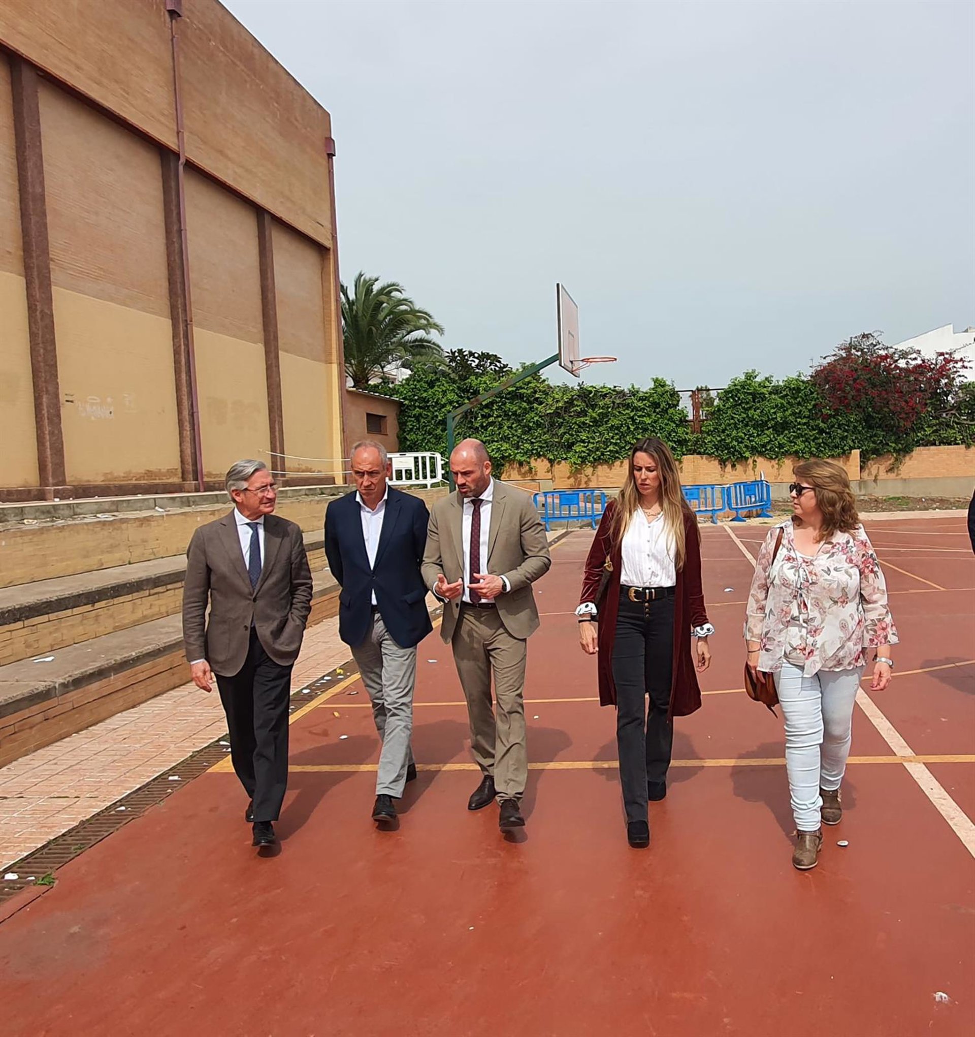 El director general de la Agencia Pública Andaluza de Educación, Manuel Cortés, el delegado de Desarrollo Educativo y Formación Profesional, y de Universidad, Investigación e Innovación en Sevilla, Miguel Ángel Araúz, y el alcalde de Tomares, José María Soriano, han visitado las instalaciones del instituto Néstor Almendros de Tomares, para analizar la situación de las fachadas y comunicar a la directora del centro educativo la marcha de expediente.