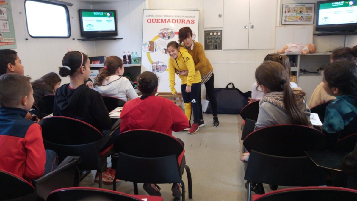 Un grupo de 39 alumnos de 5 de Primaria del CEIP La Atalaya de Níjar ha aprendido este miércoles a realizar maniobras básicas de primeros auxilios, por ejemplo ante un atragantamiento, y a detectar y evitar riesgos como éste y otros tales como caídas, golpes, cortes o quemaduras a los que se enfrentan en casa, el colegio, en el parque y las calles.